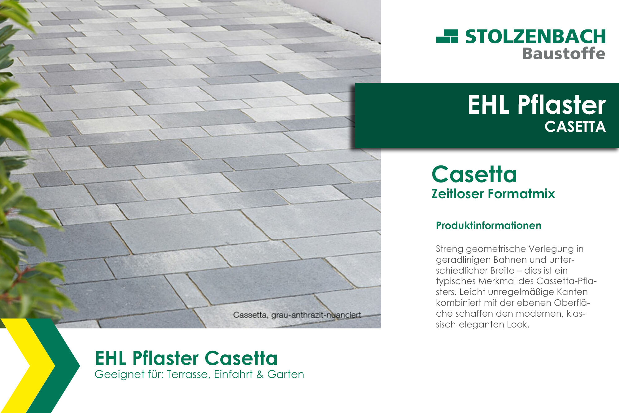 Streng geometrische Verlegung in geradlinigen Bahnen und unterschiedlicher Breite – dies ist ein typisches Merkmal des Cassetta-Pflasters. Leicht unregelmäßige Kanten kombiniert mit der ebenen Oberfläche schaffen den modernen, klassisch-eleganten Look. Versickerungsleistung: >270 l/sha Die im Merkblatt für wasserdurchlässige Befestigungen von Verkehrsflächen der Forschungsgesellschaft für Straßen- und Verkehrswesen geforderte Versickerungsleistung von 270 l/(sxha) wurden erreicht. Prüfzeugnisse sind vorhanden.