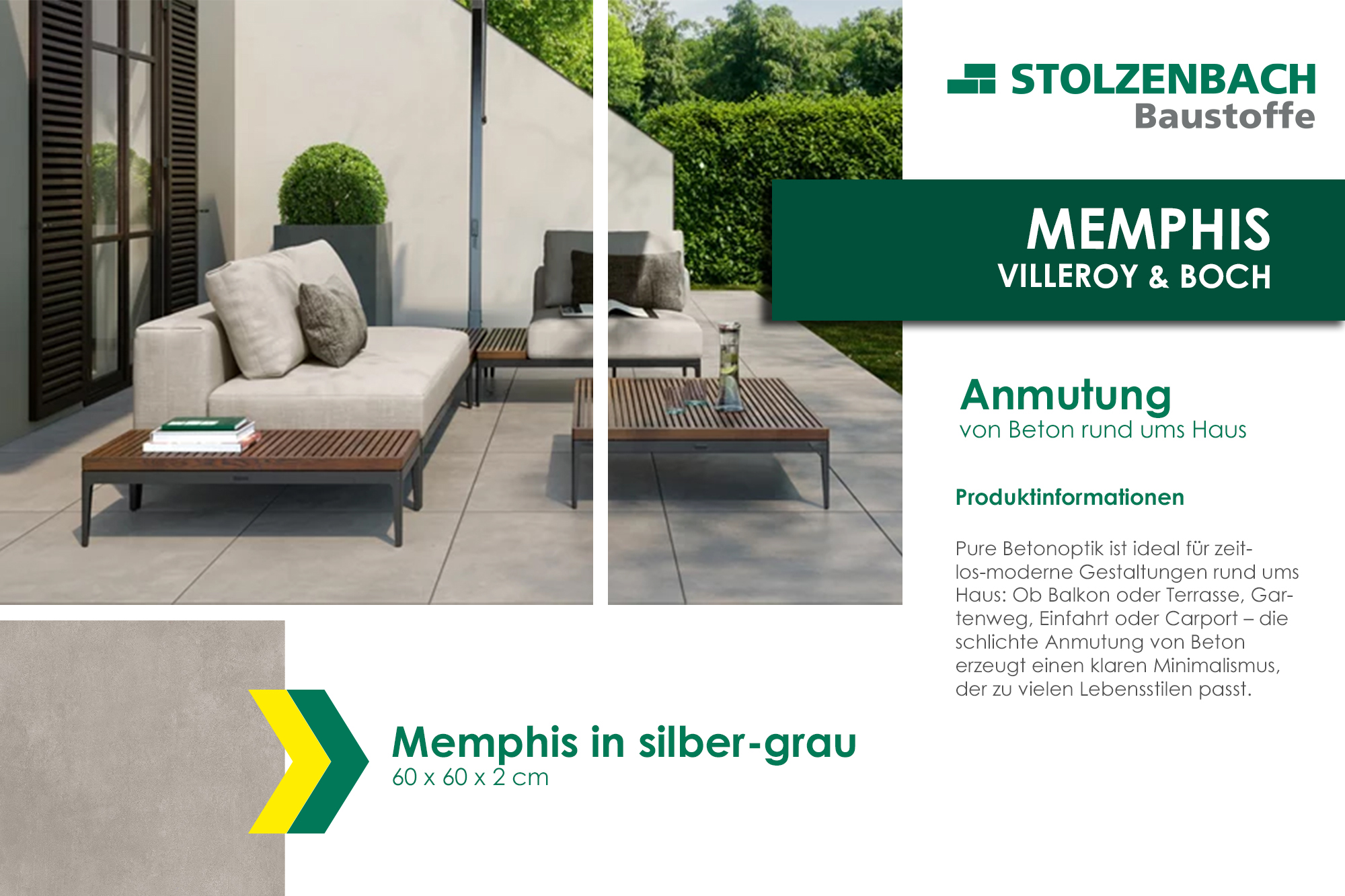 Pure Betonoptik ist ideal für zeitlos-moderne Gestaltungen rund ums Haus: Ob Balkon oder Terrasse, Gartenweg, Einfahrt oder Carport – die schlichte Anmutung von Beton erzeugt einen klaren Minimalismus, der zu vielen Lebensstilen passt. Die Fliesenserie MEMPHIS GARDEN, die speziell für Anwendungen im Außenbereich entwickelt wurde, überträgt das typische Aussehen von urbanem Sichtbeton mit harmonisch aufeinander abgestimmten Grautönen und einer leicht reliefierten Oberfläche auf hochwertiges VilboStone Feinsteinzeug.